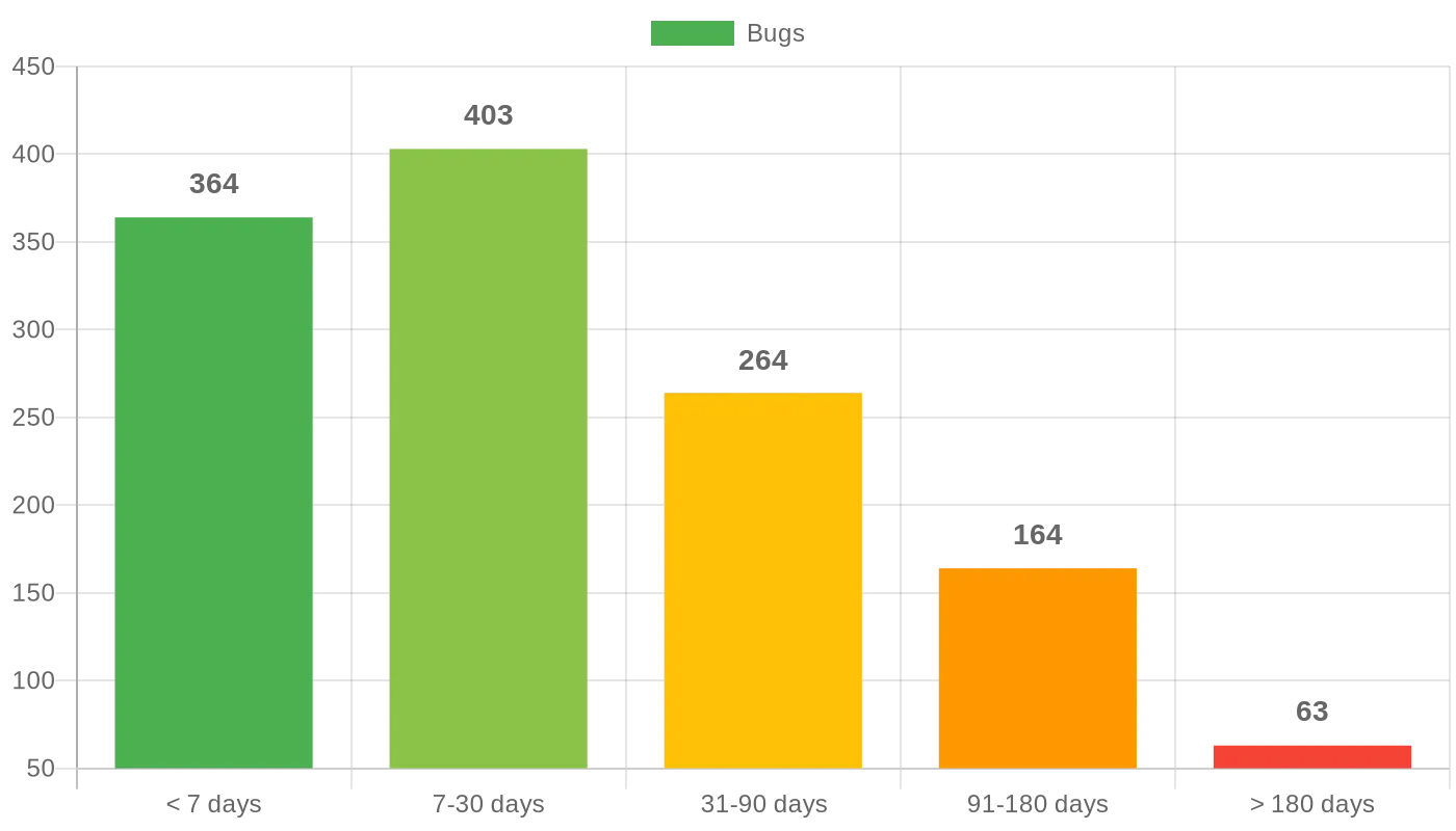 The median gap was 16 days. The mean, pulled higher by bugs that survived for months, was 46 days.