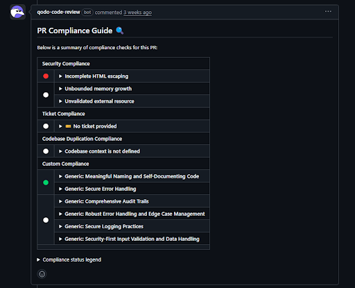 Instead of leaving scattered inline comments, Qodo posted a single PR Compliance Guide as a structured comment on the pull request, as shown in the snapshot below: