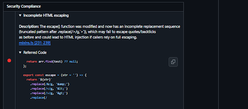 The framing is immediately different from that of typical AI reviewers. It’s not trying to “review code” line by line. It’s answering a higher-level question: is this change compliant with the standards we expect before it merges?