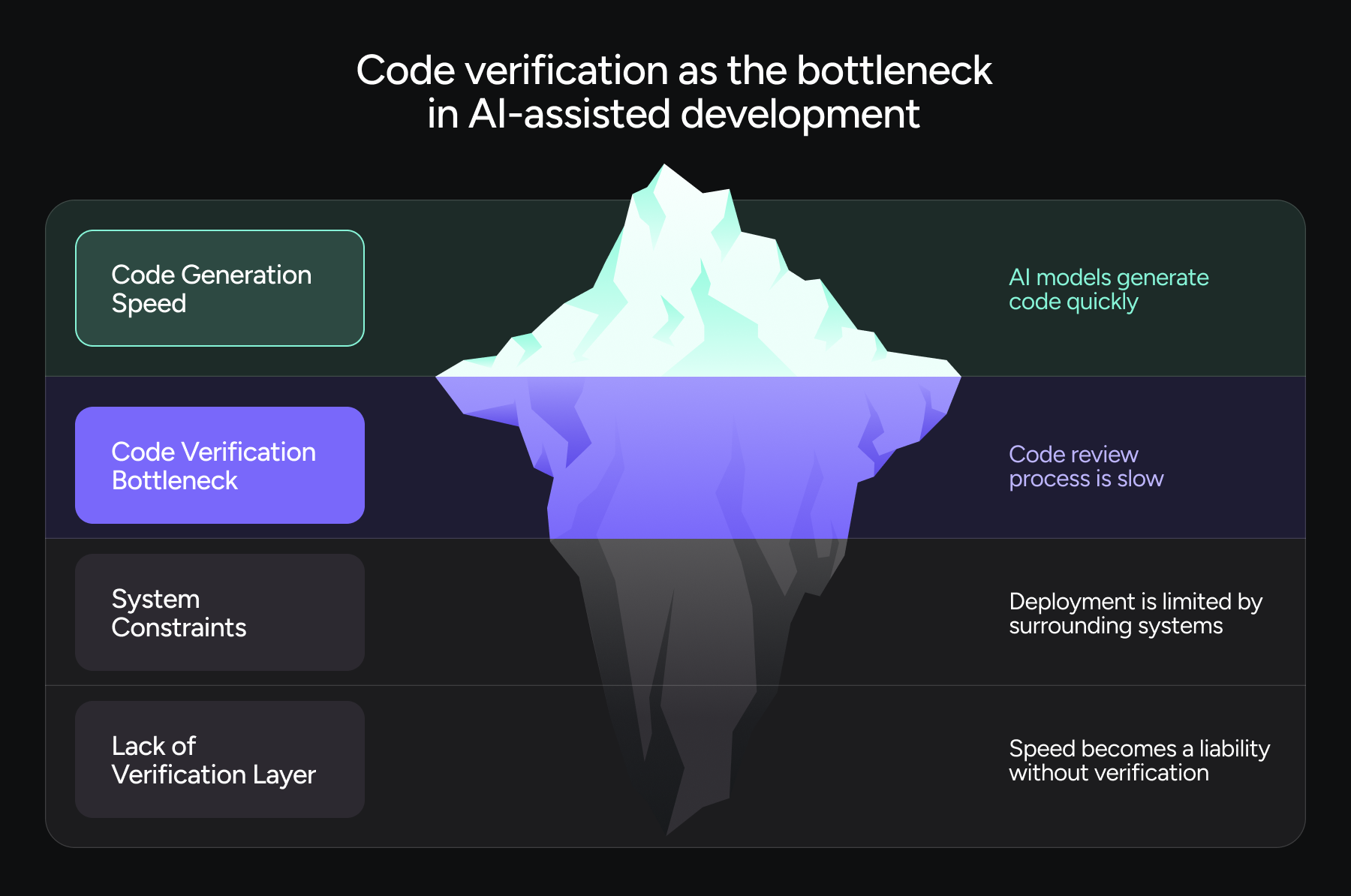When you have AI models that can generate thousands of lines of code in minutes, but your team still reviews code one pull request at a time, you’ve just moved the bottleneck, not eliminated it. You’ve made developers faster at writing code, but you haven’t solved the systems and processes around them that constrain deployment. And more specifically, without a verification layer, speed becomes a liability.
