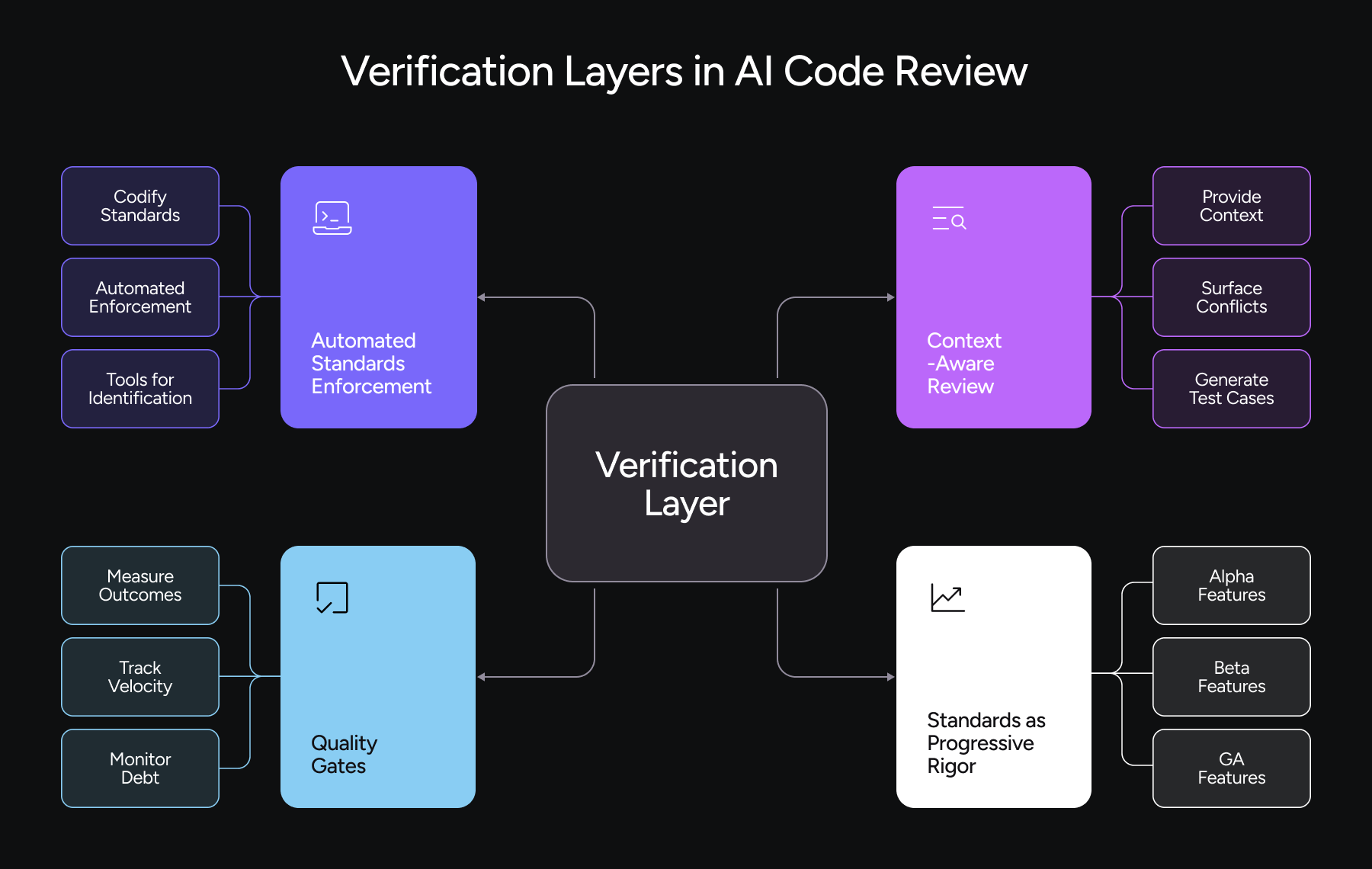 This is where the verification layer gets sophisticated. Instead of asking reviewers to evaluate whether the code works, you’re asking them to evaluate whether it’s aware of your system’s constraints, your team’s patterns, your architectural vision, and more.