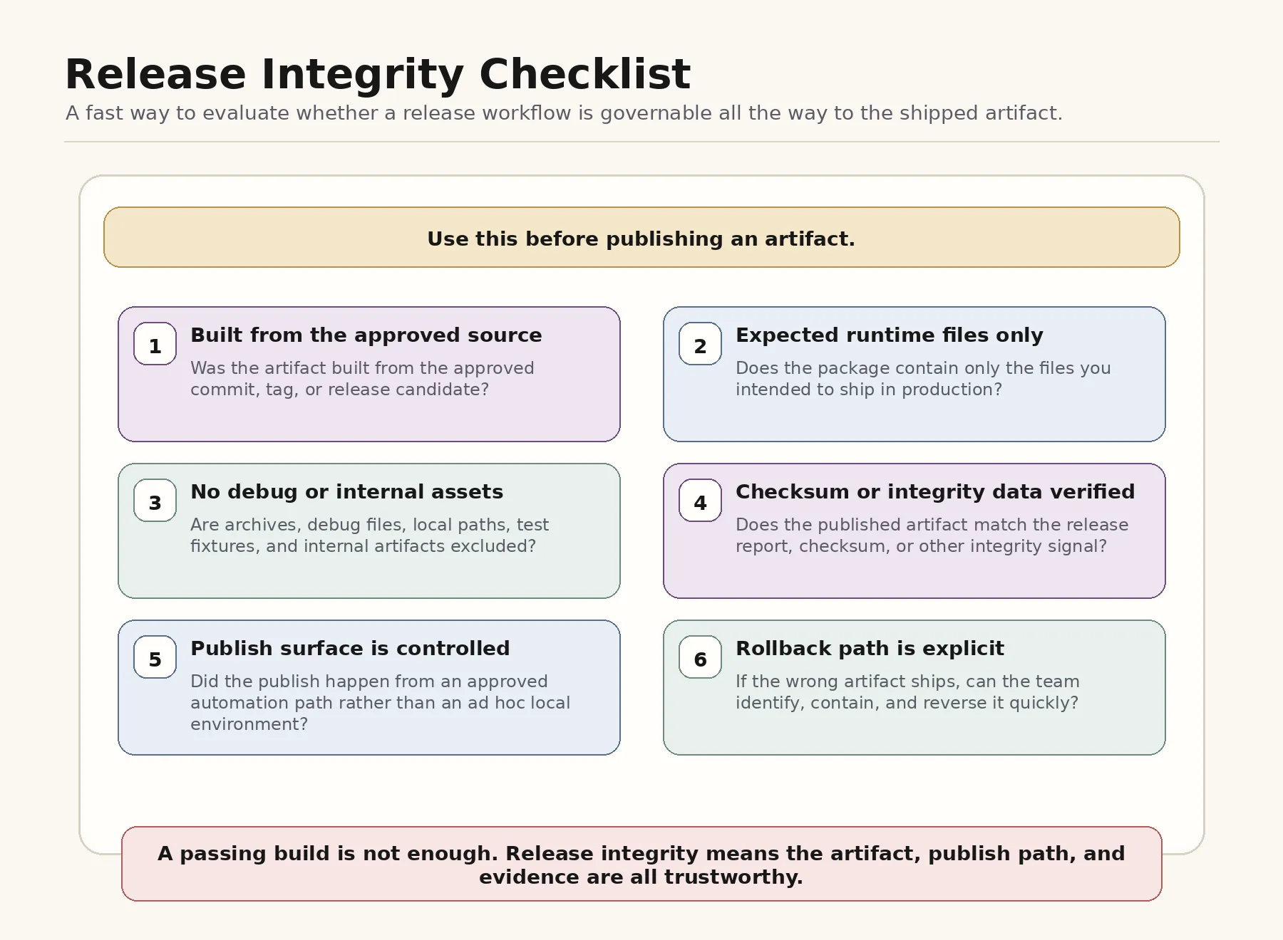 Can you see the release plan before publishing? Is the publish surface constrained? Does someone verify the final artifact independently? Do trust-sensitive release changes trigger review? Is there an audit trail if something goes wrong?