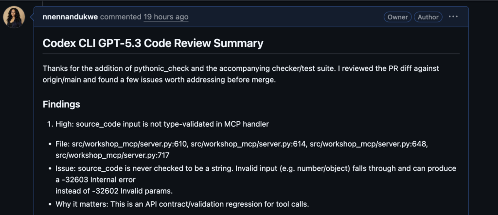 Codex CLI running GPT-5.3 delivered a precise, actionable review of the same MCP tool PR we’ve been examining. It found four issues with severities, line numbers, and concrete fixes, and even called out missing test coverage. But it still stopped at correctness and contract behavior, missing the risks that Qodo surfaced.