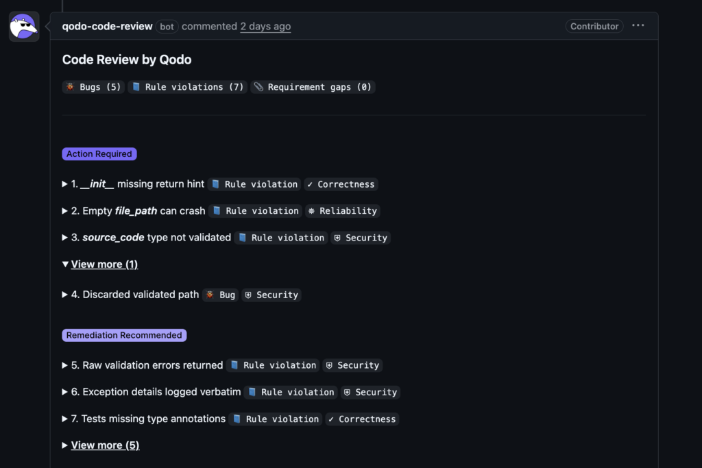 Qodo’s review lives at the system level. It understood the existing PathValidator, the MCP server pattern, and why canonical paths and logging matter in an agentic environment.