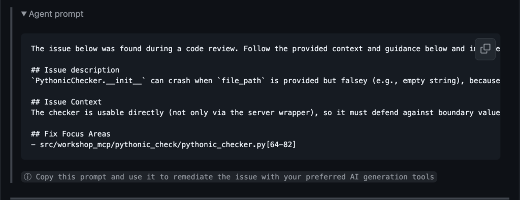 Then it gave remediation code patterns and provided agent prompts to implement the fix safely.