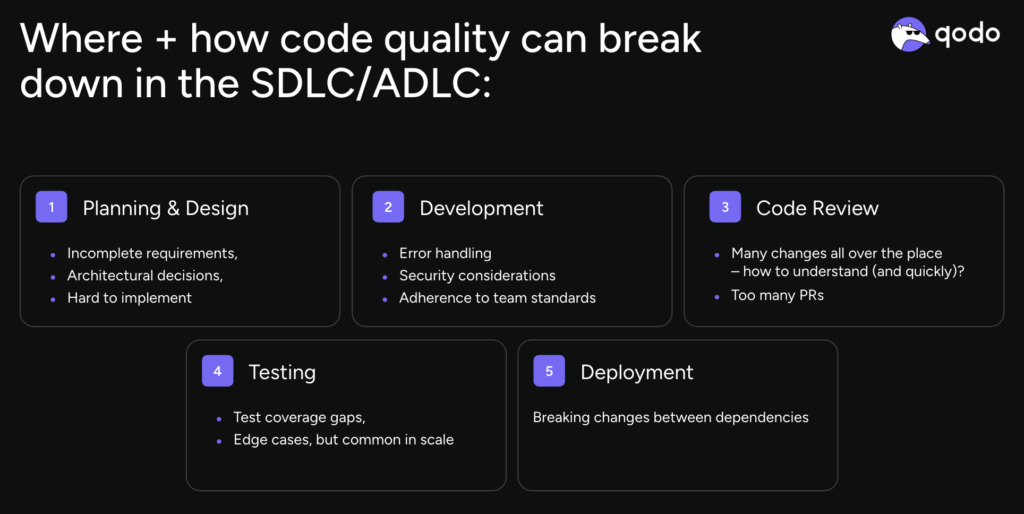 That problem can also appear early in the development lifecycle. Code quality can break down in planning and design, in development, in review, in testing, and in deployment. By the time a pull request is open, some of the most expensive mistakes have already been made.