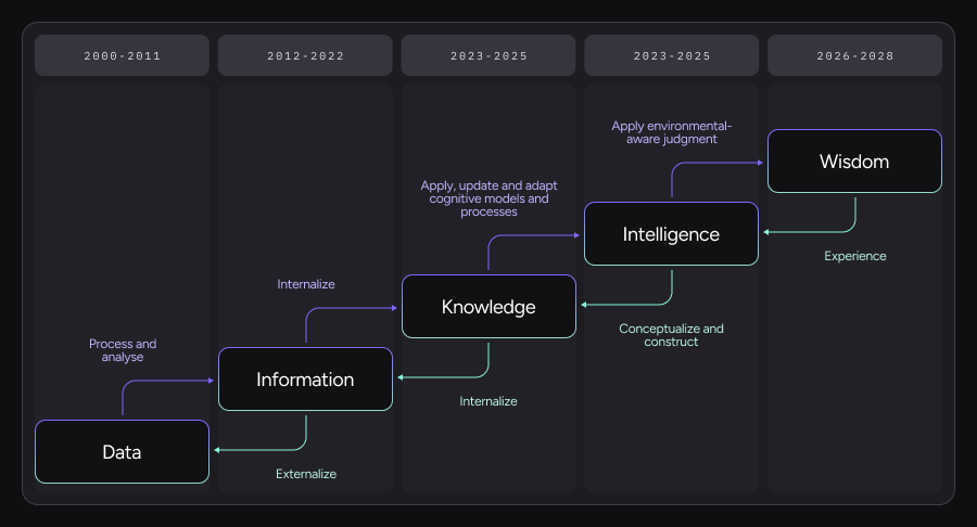This progression explains why scaling models alone hit diminishing returns. Moving up the stack (from information to intelligence and toward wisdom) requires integration layers, protocols, memory, verification, and governance. Intelligence didn’t get bigger. It got externalized, structured, and orchestrated.