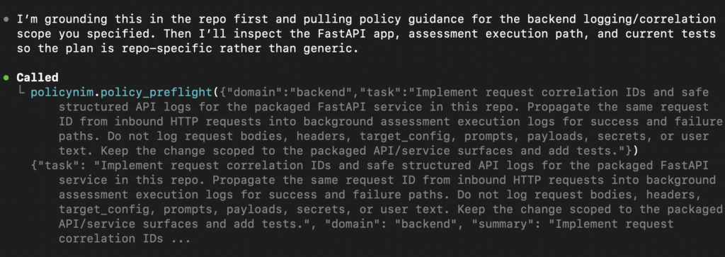 On the agent side, I can expose the same behavior through MCP with policynim mcp --transport stdio (or streamable-http), then call tools like policy_preflight and policy_search in other projects to verify coding implementation plans against best practice policies the MCP checks against.