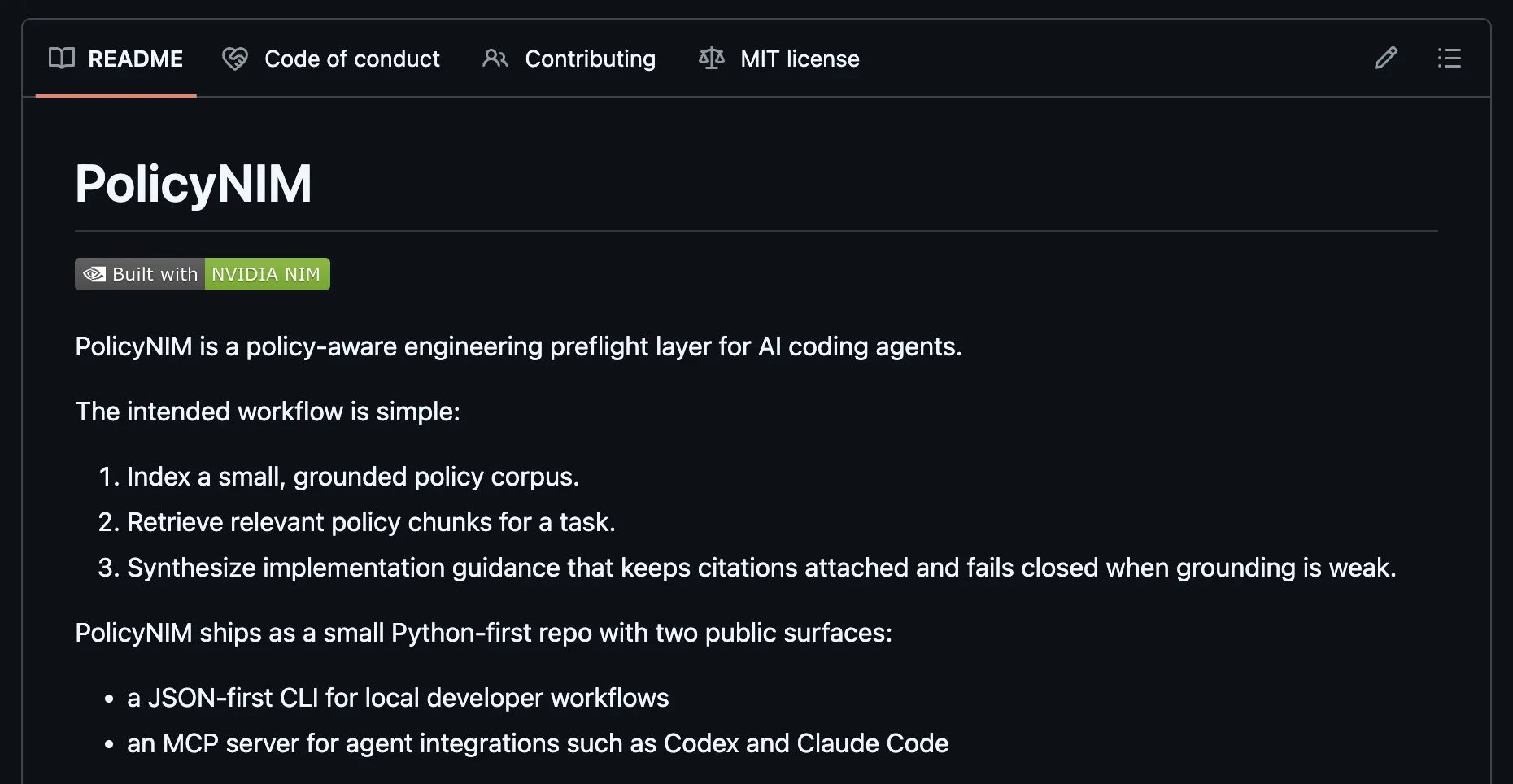 I built PolicyNIM as a thin, pre-coding layer for coding agents. The goal was to give agents policies on security and backend implementations that mirror high quality standards for shipping software. With that type of context, agents can begin generating code in line with the policies.