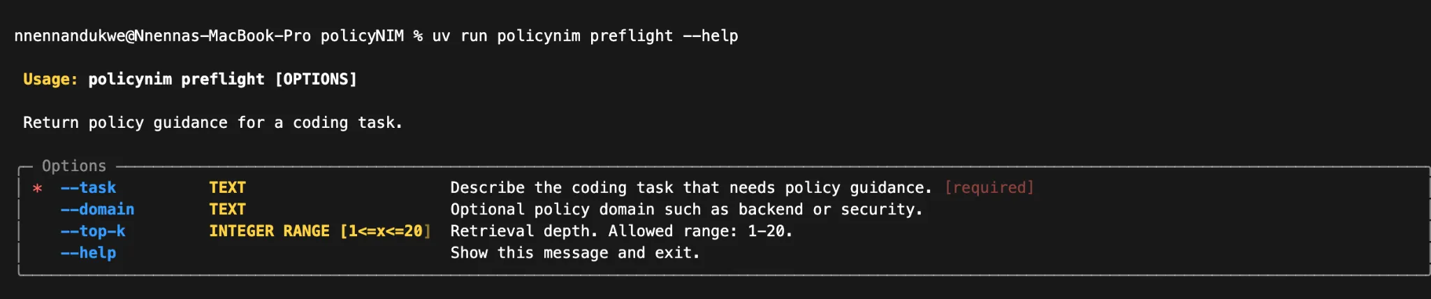 On the CLI side, I can run policynim preflight and policynim search.