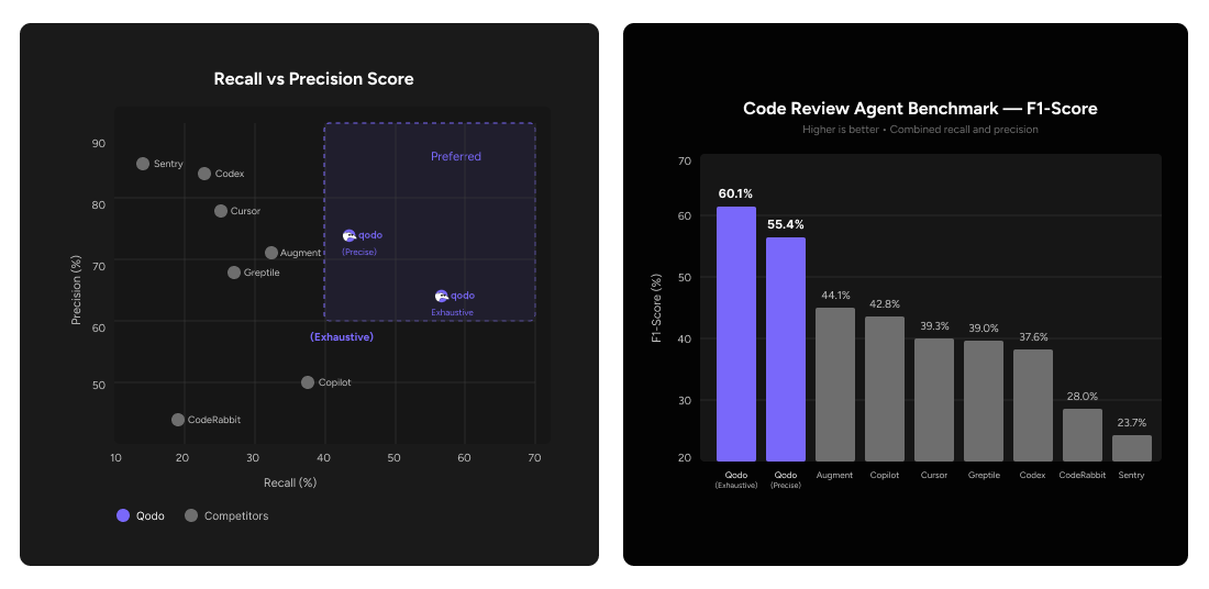 This novel approach is uniquely designed to simultaneously evaluate both code correctness (bug detection) and code quality (best practice enforcement) within a realistic code review context and at a significantly larger scale – 100 PRs containing a total of 580 issues. In a comparative evaluation pitting the Qodo model against 7 other leading AI code review platforms, Qodo demonstrated superior performance, achieving an F1 score of 60.1% for reliably identifying this diverse set of defects. The benchmark, including tools evaluated reviews, is publicly available in our benchmark GitHub organization. The following sections detail our benchmark creation methodology, experimental setup, comparative results, and key takeaways from this evaluation.