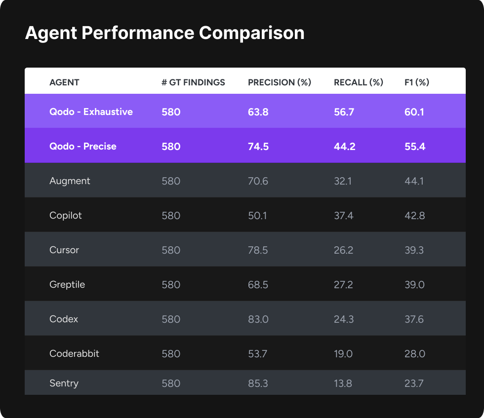 Qodo, in contrast, demonstrates the highest recall by a significant margin, while still maintaining competitive precision, resulting in the best overall F1 score. This indicates that Qodo is able to detect a much broader portion of the ground-truth issues without overwhelming the user with noise. Importantly, precision is a dimension that can be tuned post-processing according to user preference (e.g., stricter filtering of findings), whereas recall is fundamentally constrained by the system’s ability to deeply understand the codebase, cross-file dependencies, architectural context, and repository-specific standards.