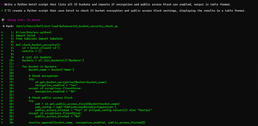I prompted Amazon Q with: “Write a Python boto3 script that lists all S3 buckets and reports if encryption and public access block are enabled, output in table format.”