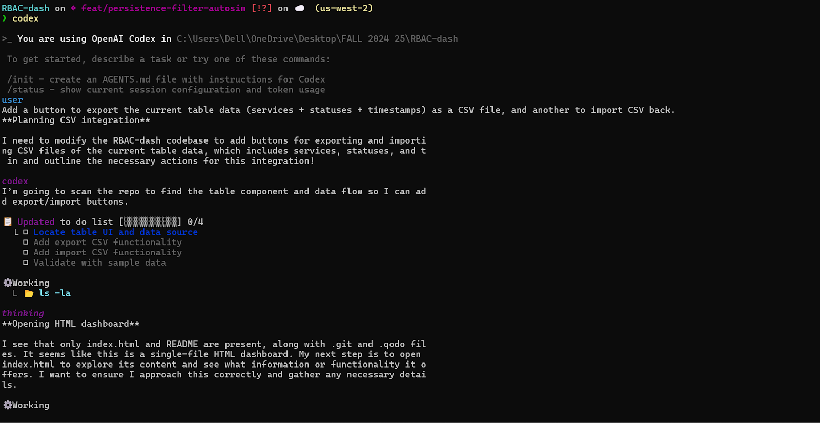 I prompted Codex with: “Add a button to export the current table data (services + statuses + timestamps) as a CSV file, and another to import CSV back.”