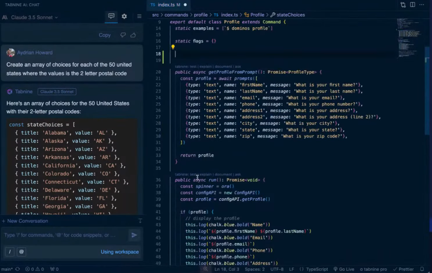In this hands-on evaluation, Tabnine was tested while building a CLI Profile command in a TypeScript project. The task involved capturing user details such as name, email, address, state, and zip, and storing them in a structured format.