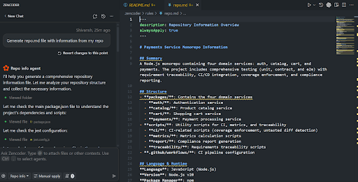 Zencoder saved the repo.md file to a new directory (.zencoder/rules/repo.md), providing a clear, structured overview of the entire project.