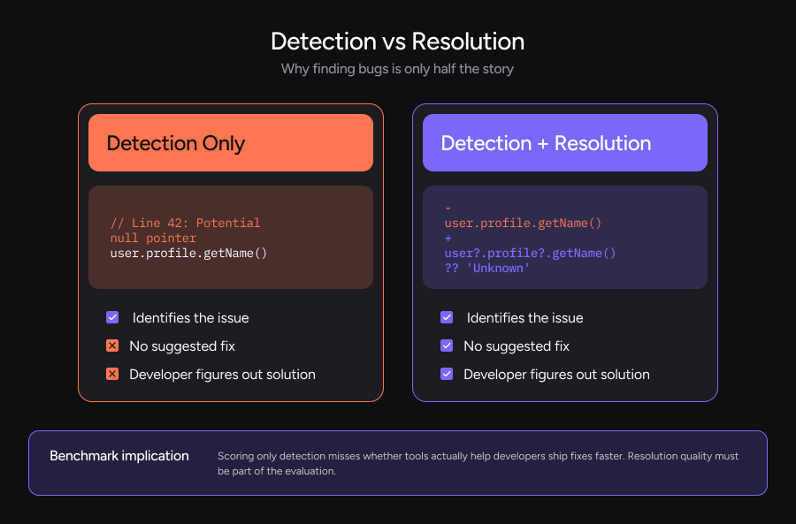 Effective code review tools don’t just flag problems; they help developers fix them. Can the tool suggest a fix? Is that fix correct? Does it follow the patterns and conventions of the codebase? Including resolution quality in ground truth transforms a detection A benchmark should evaluate whether tools provide actionable remediation guidance, not just whether they can identify that something is wrong.