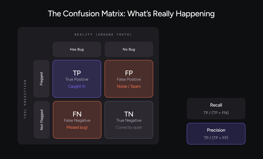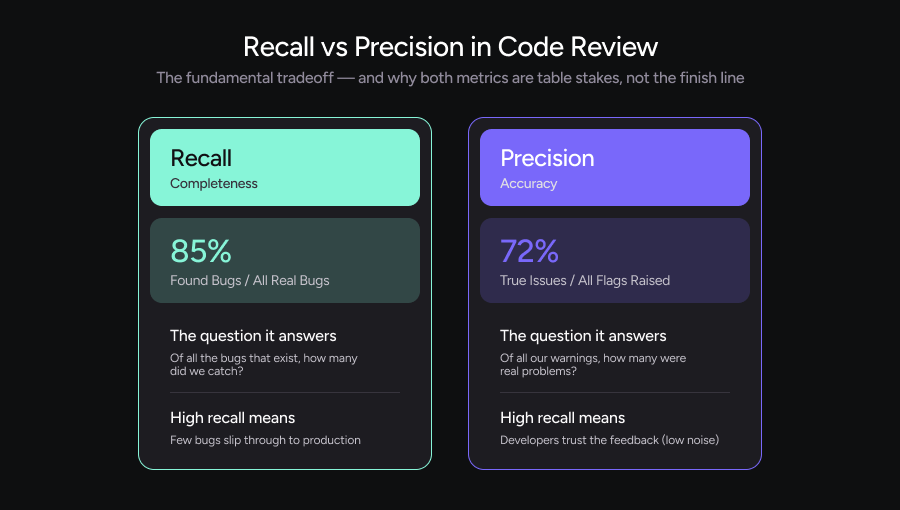 Recall and precision are table stakes. Yes, you need to know whether a tool catches bugs (recall) and whether its suggestions are accurate (precision). But these metrics alone miss critical aspects of the developer experience.
