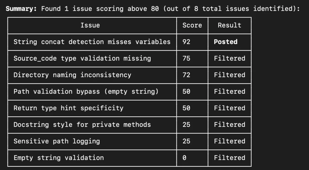 This assigned each issue a numeric score and applied a hard threshold. Anything below 80 was automatically filtered out. Only one issue survived: a string concatenation heuristic bug.