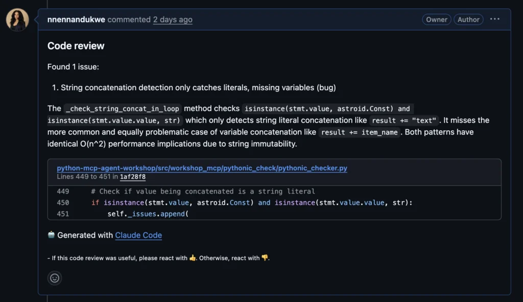 The final PR review comment from Claude Code contained a single, focused remark about improving string concatenation detection in loops. From the perspective of anyone reading the PR, the message was essentially: