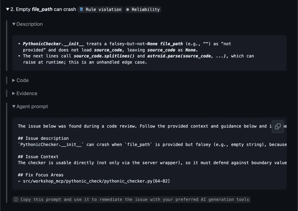 That means you never have to wonder, “What did the tool see, but minimize?” And when well-organized with actionable remediation steps (agent prompts for fixes), that helps you close the feedback loop easily for issues you might be on the fence about.