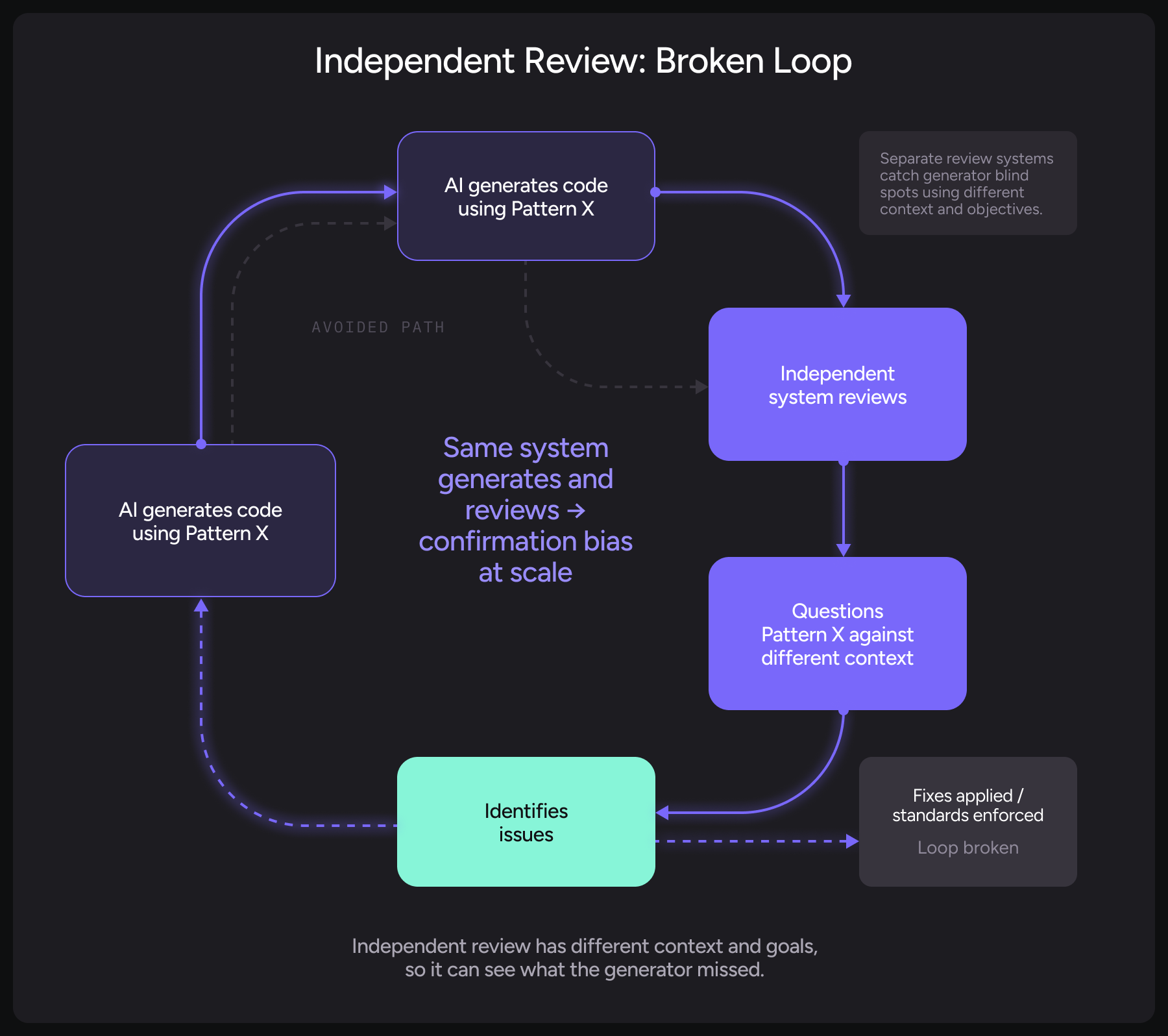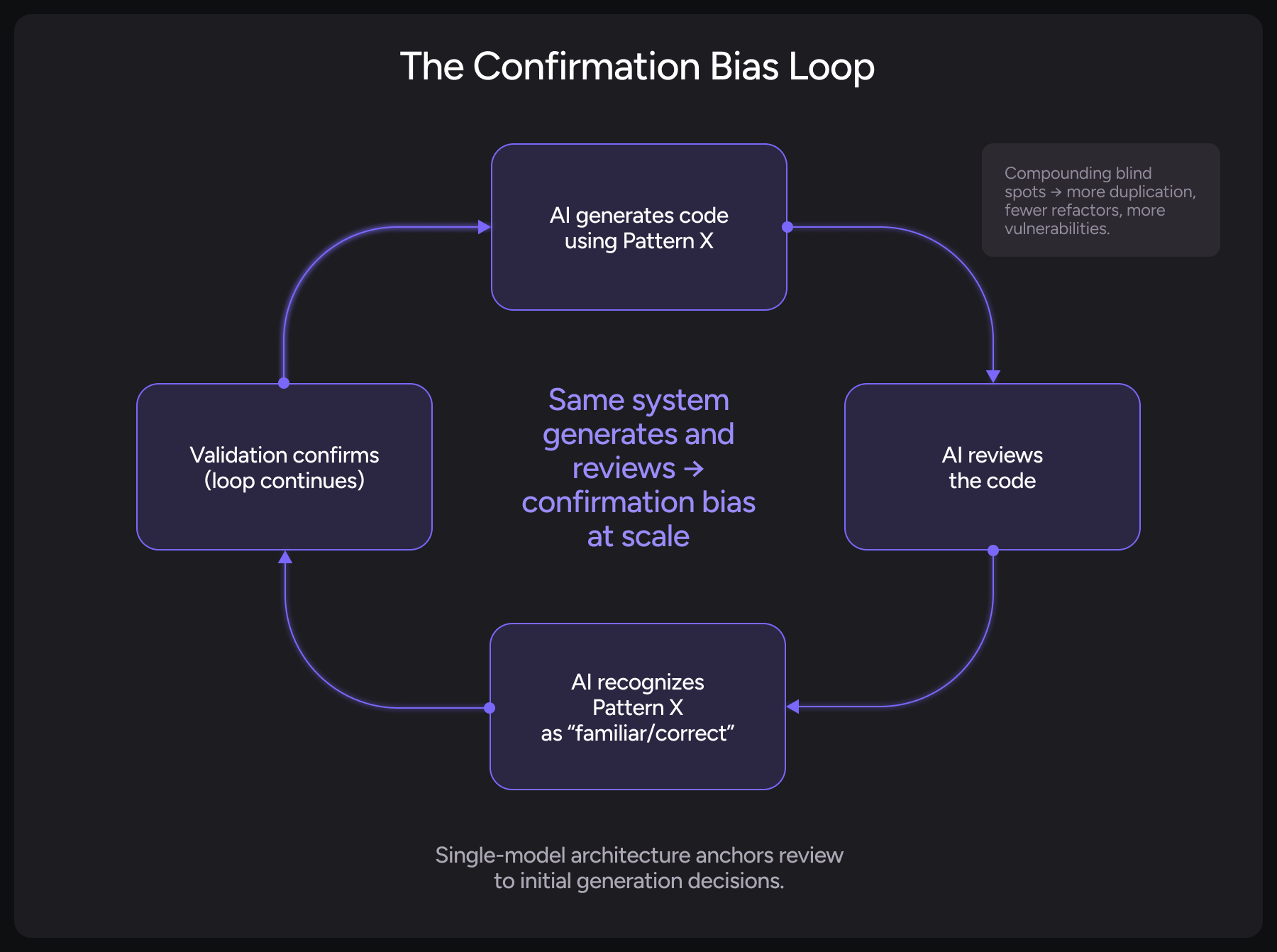 When the same AI system writes your code and reviews it, you’re not getting quality assurance. You’re getting confirmation bias at scale.