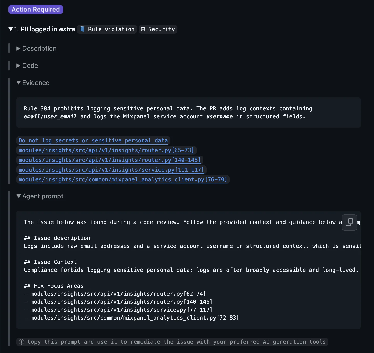 - In the PR: Review agents catch violations before merge and suggest fixes