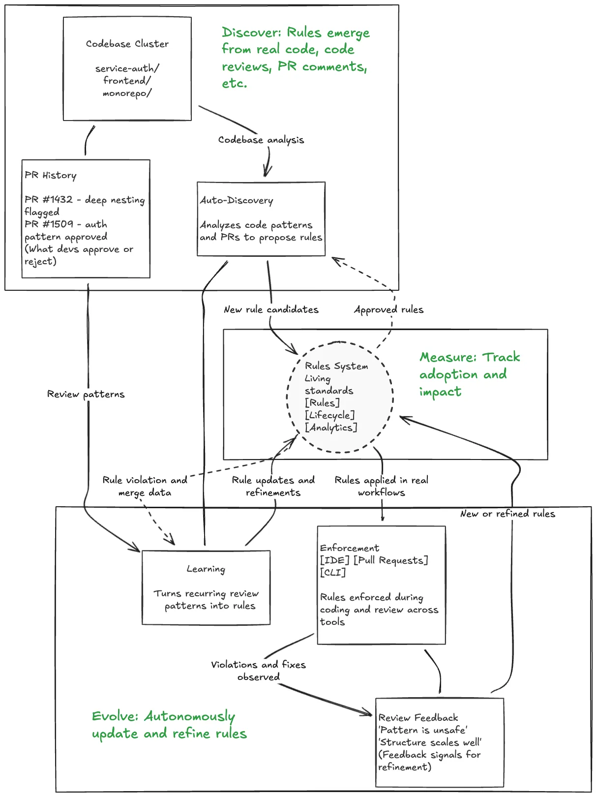 When a recurring PR comment becomes a rule, and that rule prevents the same issue in future PRs, you’ve automated institutional knowledge. When rule analytics show which standards are working, you’ve made quality measurable. When rules evolve based on real violations and fixes, you’ve built a system that gets smarter over time.