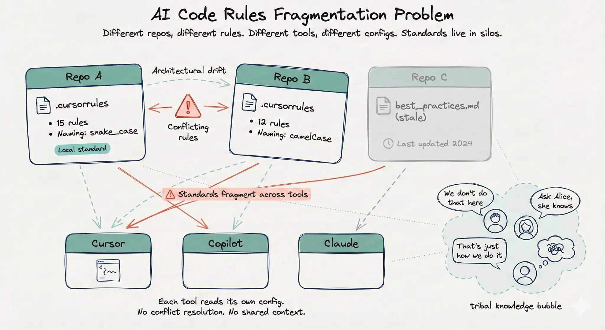AI coding tools (Cursor, Copilot, Claude Code) read whatever config file you point them at. But they don’t reconcile conflicts. They don’t flag when rules decay. They don’t tell you which standards are helping versus creating noise. They treat every instruction as equally valid, even when two rules contradict each other.