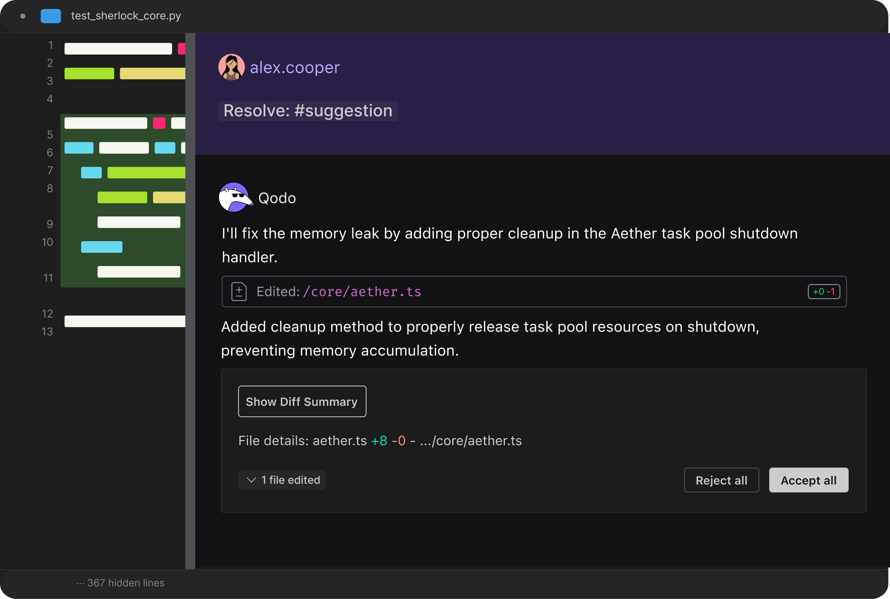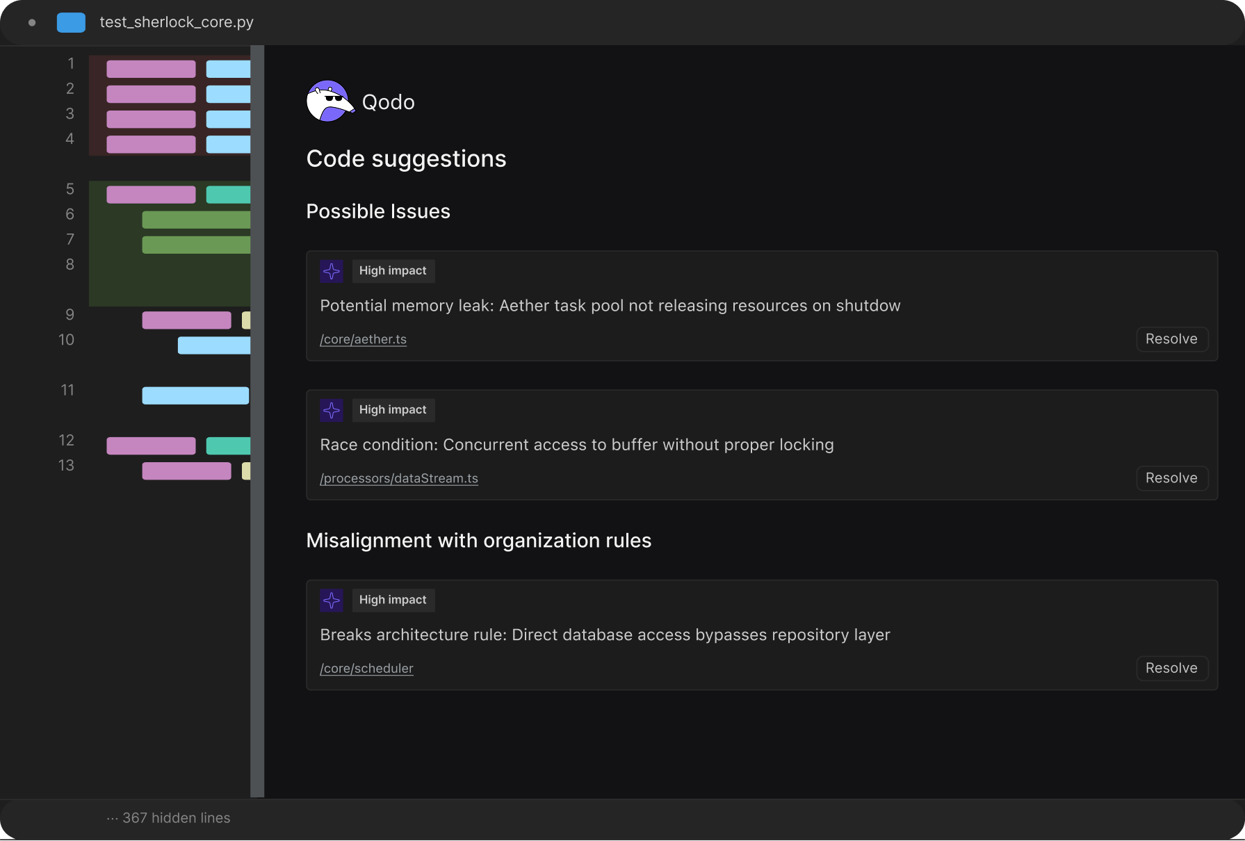 Qodo runs agentic review workflows in your IDE, along side AI copilots, to review local diffs for security risks, non-compliant code and other issues before code makes it to a repo.