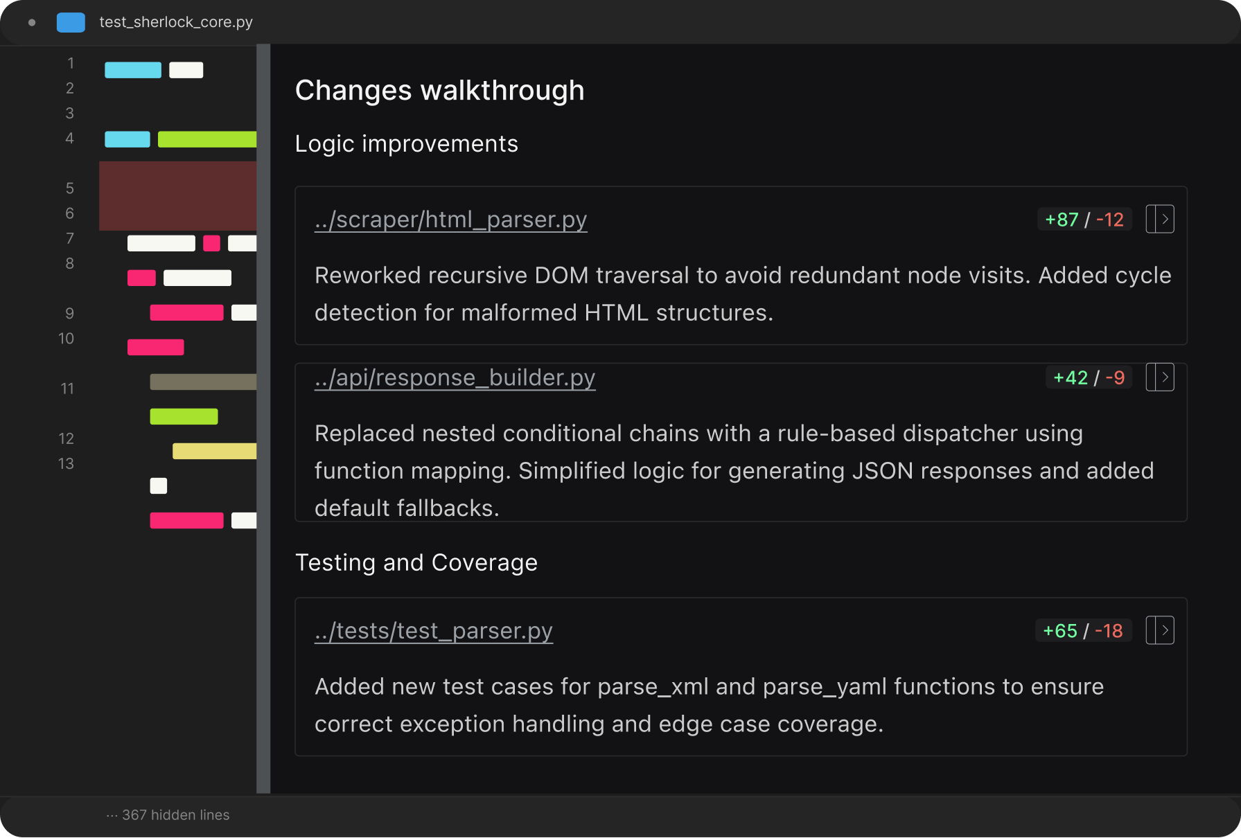 Agents generate natural-language explanations for every change, linking it to related code, dependencies, and prior PRs so developers can understand intent and impact instantly.